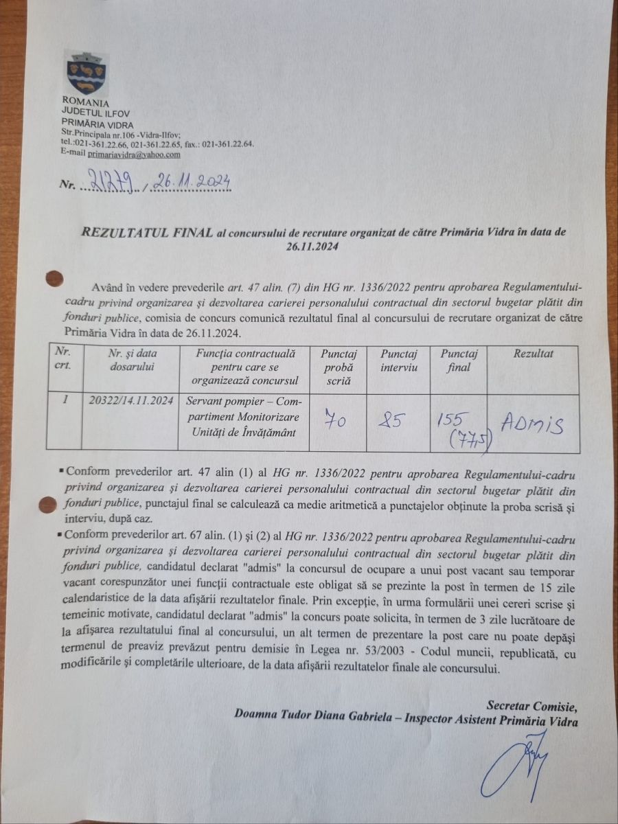 Rezultatul FINAL la concursul de recrutare organizat de catre Primaria Vidra in data de 26.11.2024