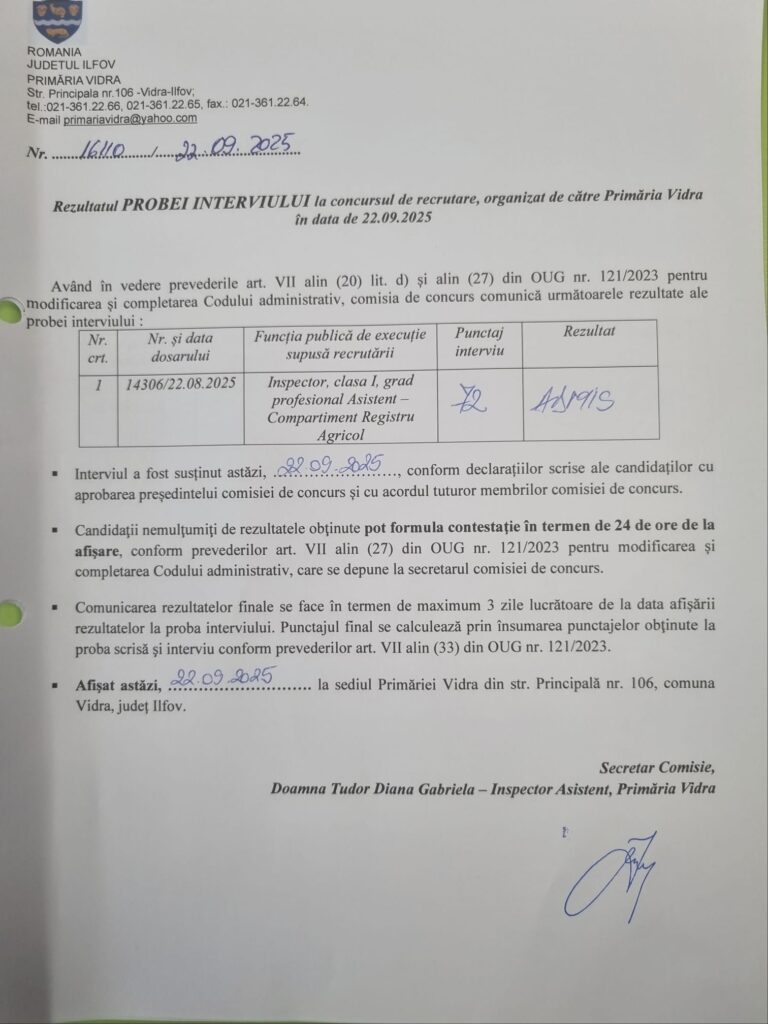 Rezultatul PROBEI INTERVIULUI la concursul de recrutare, organizat de catre Primaria Vidra in data de 22.09.2025